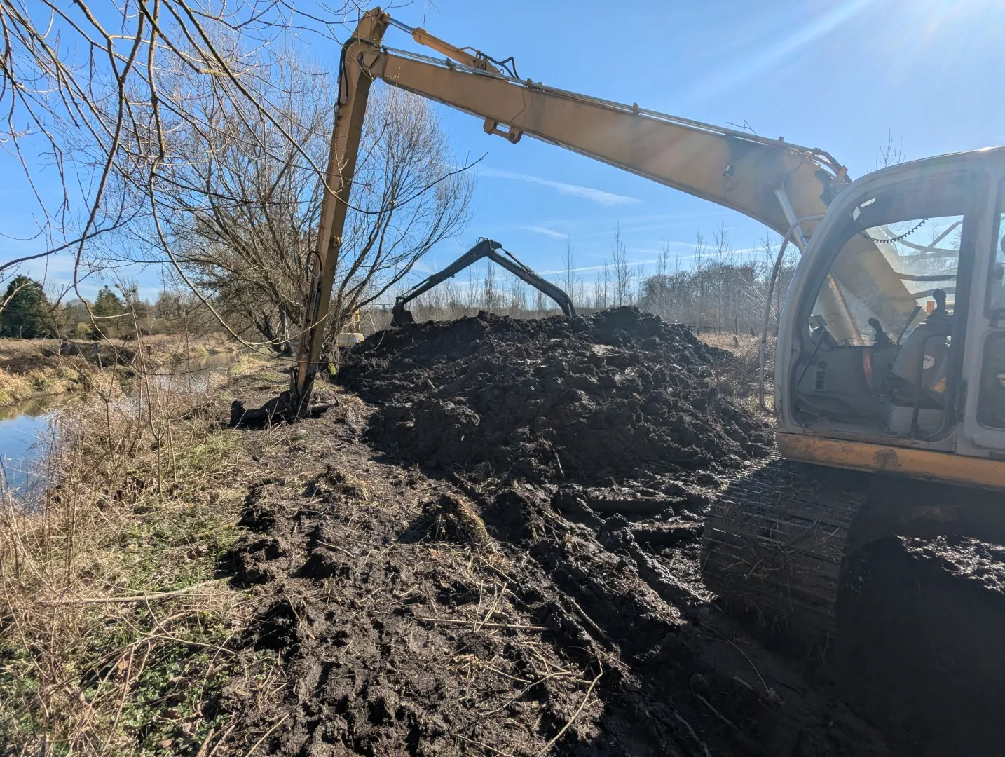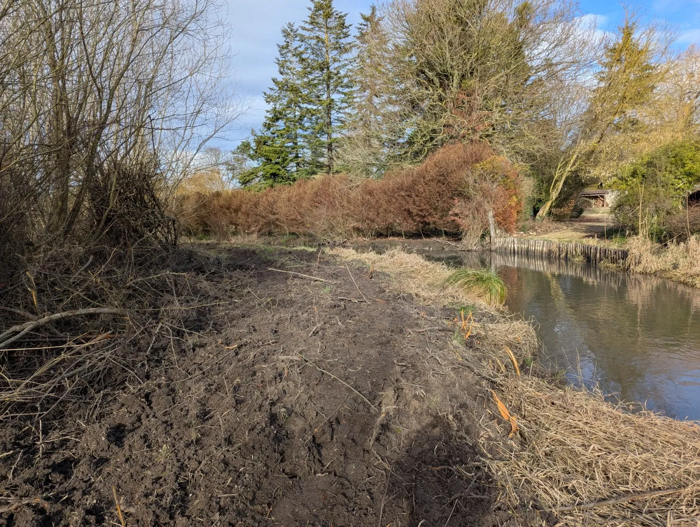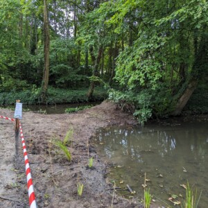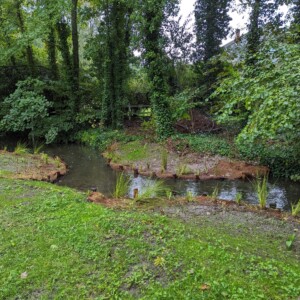 - Mise en place de 2 banquettes végétalisées supplémentaires dans le lit de l’Aunette (réutilisation de la terre de déblai issue de l’étrépage de la zone humide et de la création des mares)